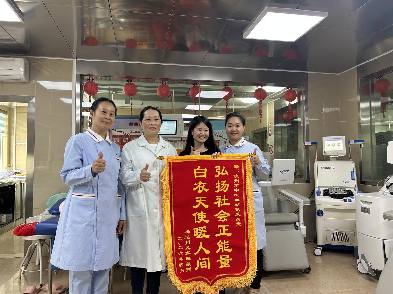 4月15日,钦州市中心血站机采室内暖意融融。市民杨女士将一面印有“弘扬社会正能量 白衣天使暖人间”的锦旗送到机采室“机采四宝”团队手中,感谢他们用专业与耐心,帮她走出“高价买血”的误区,通过正规途径解决了家人的用血难题。