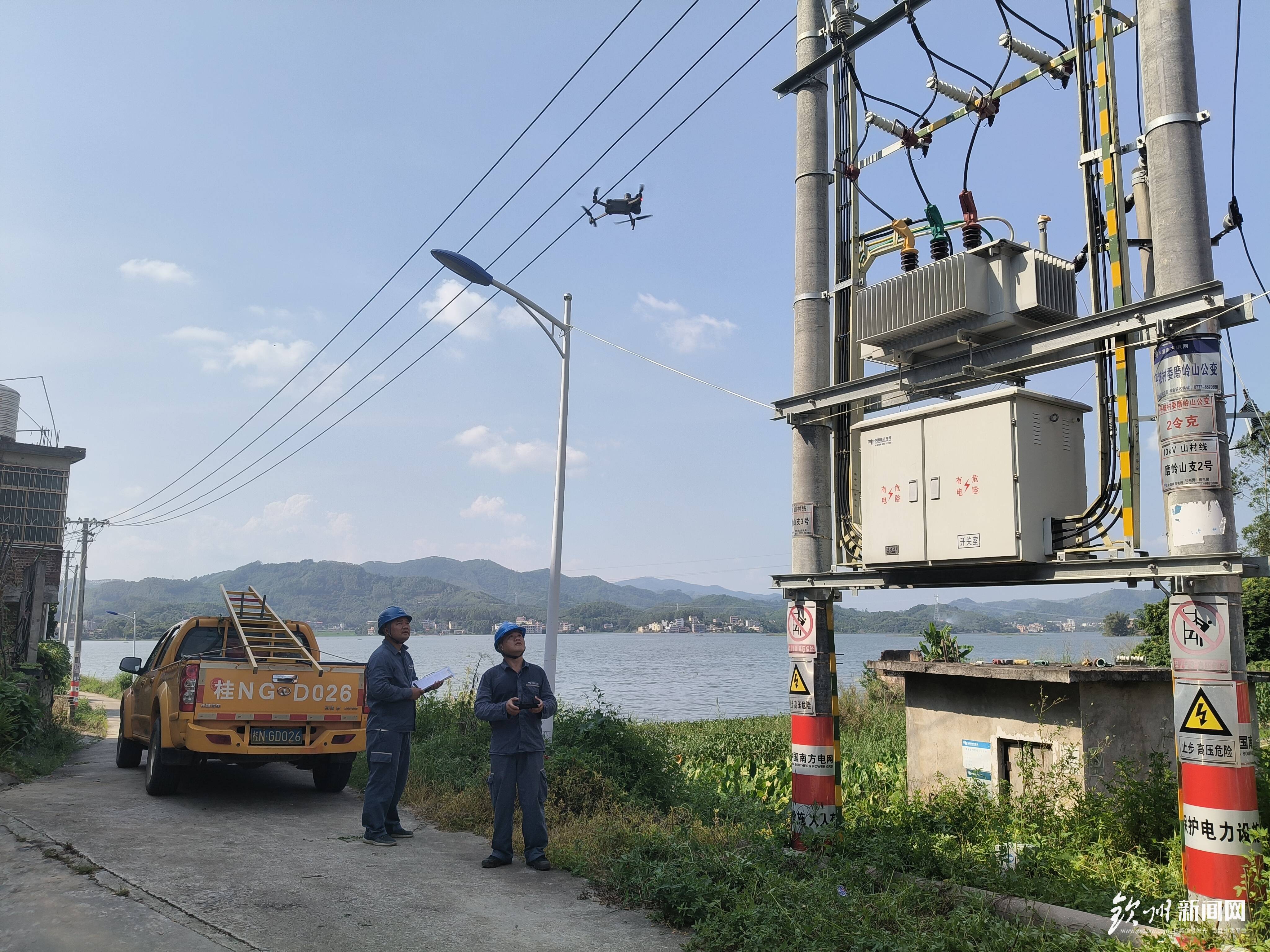 9月4日,在台风“摩羯”来临前,钦州灵山供电局平山供电所工作人员对10千伏山村线平坡村委磨岭山公变台区等进行巡视检查。(郑媚)