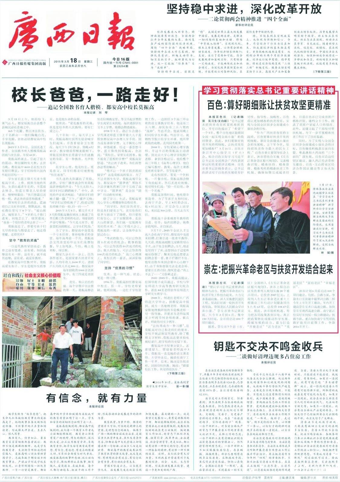 2015年3月18日,广西日报刊发《校长爸爸,一路走好!》一文。