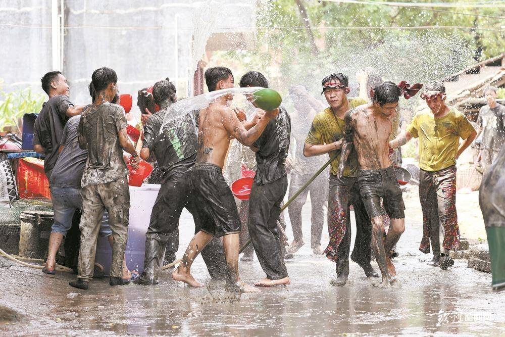 群众向“山猪”喷水泼泥,现场乐成一片。