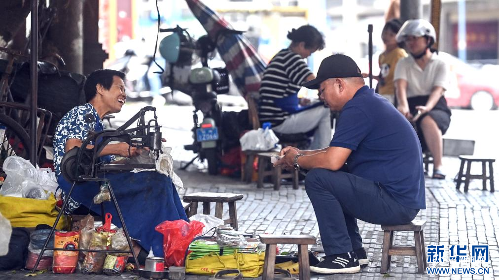 9月22日,市民(前右)在钦州老街找手艺人(前左)修补鞋包。新华社记者 张爱林 摄