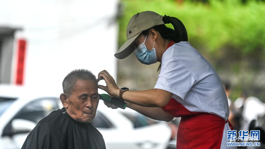 9月22日,青年志愿者(右)在钦州老街给一位老人免费理发。新华社记者 张爱林 摄
