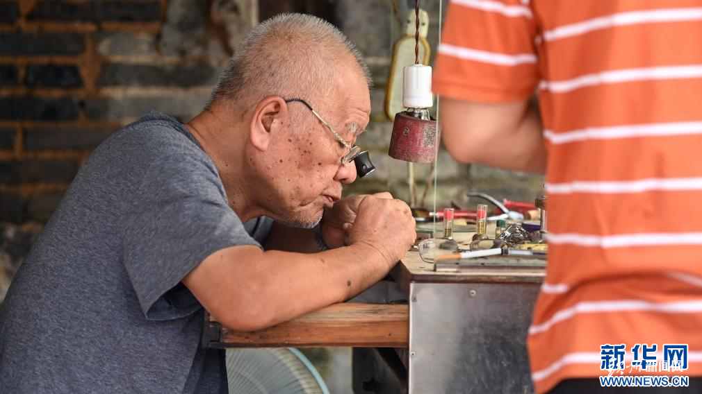 9月22日,一位老匠人在钦州老街给市民修理手表。新华社记者 张爱林 摄