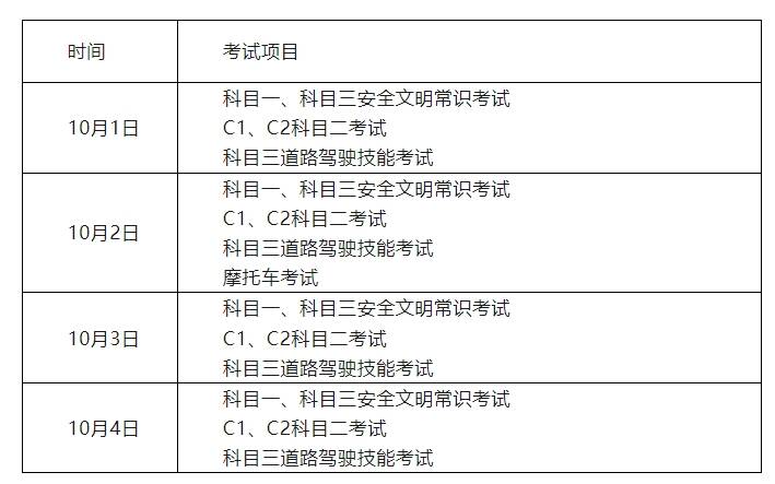 4.摩托车考试(钦州市车管所,办公地址:钦州市钦南区金锋水泥公司西北侧50米)。具体考试项目安排如下表: