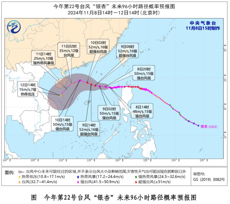 今年第 22号台风“银杏” 于11月4日在菲律宾以东的西北太平洋洋面上生成,6日夜间由强台风级加强为超强台风级,7 日晚上在菲律宾吕宋岛西北部沿海登陆后,逐渐减弱为强台风级,今天(8日)早上移入南海东北部海面, 下午 14时中心位于海南省三沙市(西沙永兴岛)东偏北方向约 650 公里的海面上(北纬 18.4度、东经 118.3度),中心附近最大风力 15 级(48米/秒),中心最低气压 945百帕。预计,“银杏”将以每小时 20 公里左右的速度向偏西方向移动,强度略有增强,最强可达强台风级或超强台风级(15~16 级,48~52米/秒),10日趋近海南岛东南部至西沙群岛一带海面(见图)。