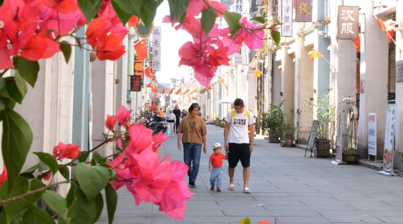 在光影婆娑间,一对父母牵着孩子的手,一边欣赏美景,一边享受着难得的亲子时光。孩子兴奋地指着路边的花朵,父母则耐心地为他讲解,一家人的笑声和话语在老街回荡,显得格外温馨和谐。