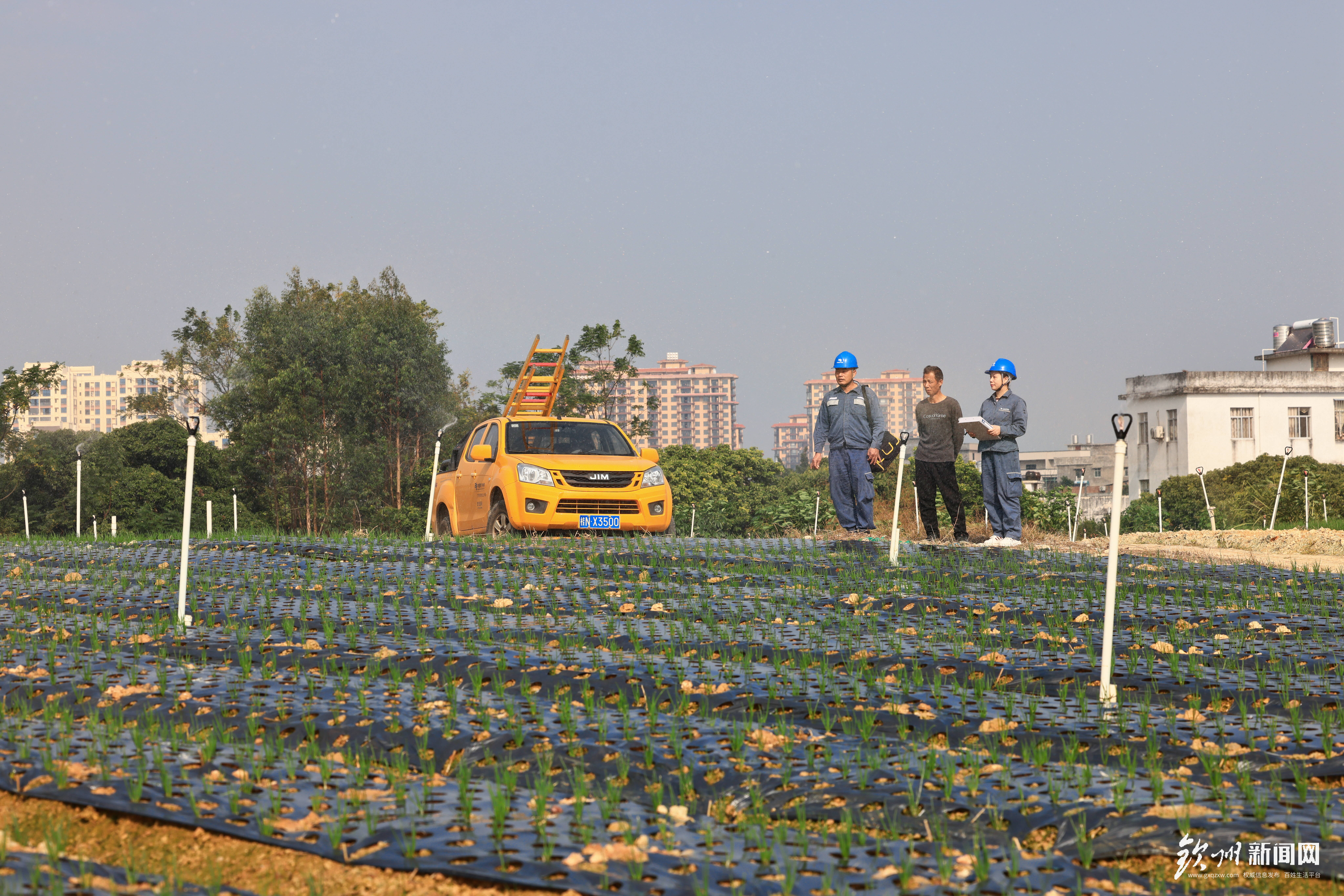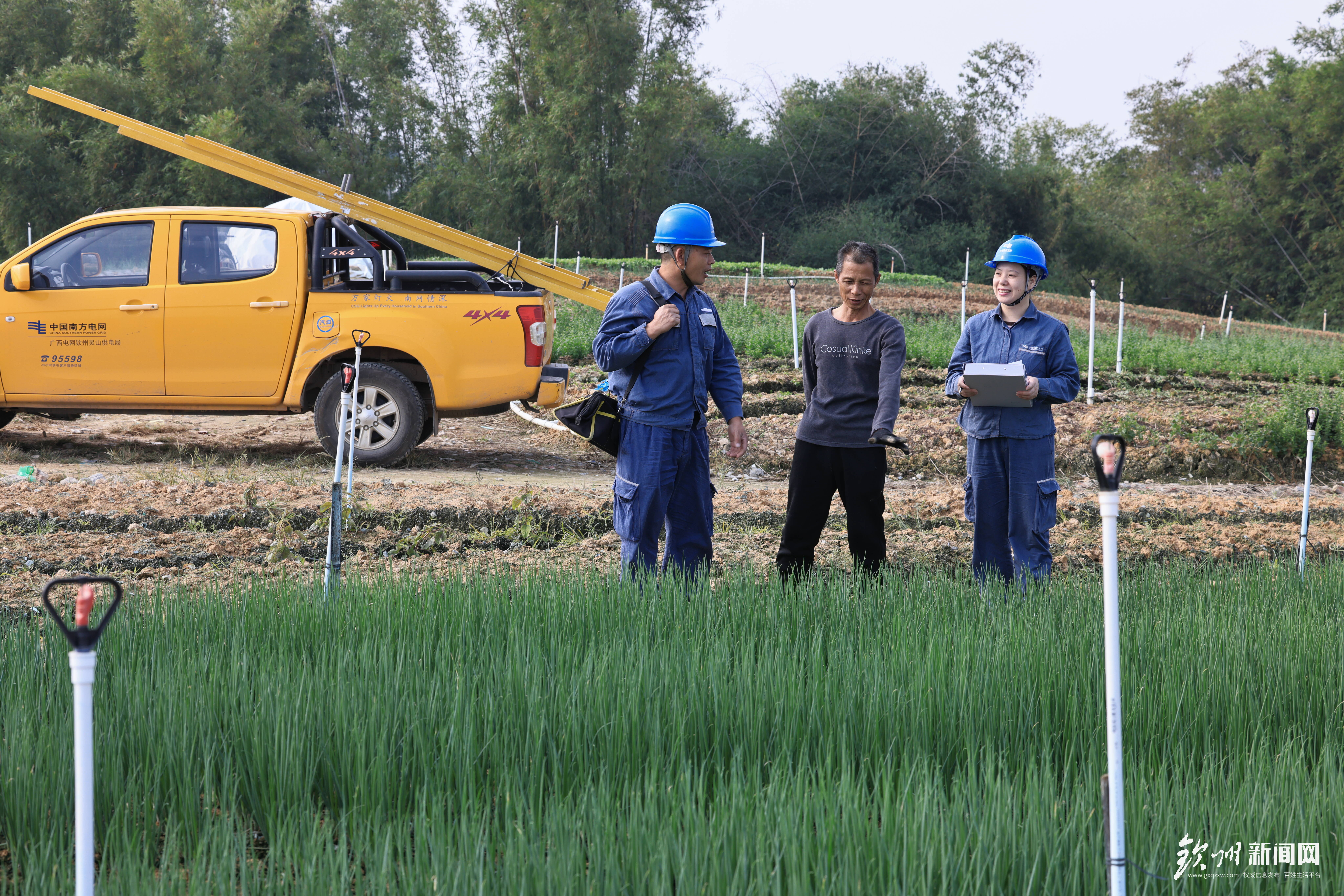 11月8日,钦州灵山供电局新圩供电所党员服务队到灵山县新圩镇独树村香葱种植基地走访,了解香葱种植情况和灌溉用电需求。陈心诚 摄