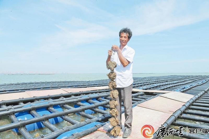 图为在钦州市大蚝养殖示范区的新型抗风浪蚝排养殖基地,养殖户郑宏明展示养殖的大蚝。曾开宏 摄