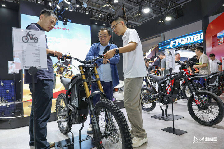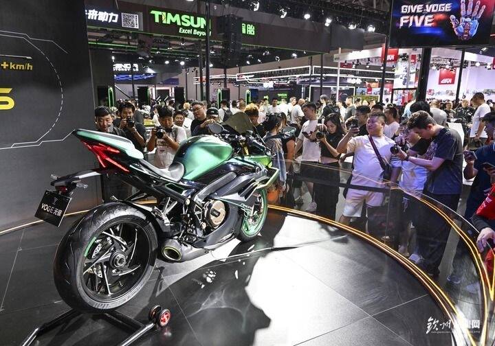 第二十三届中国国际摩托车博览会于2025年9月19日至22日在重庆举行。观众在现场参观国产新能源摩托车。新华社记者陈诚摄
