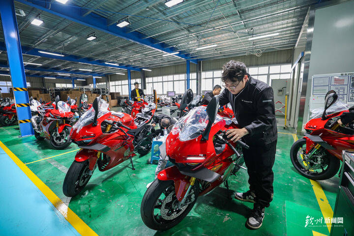 2026年4月1日,工作人员在重庆两江新区“张雪机车”生产车间对下线整车进行入库发车检测。新华社记者 黄伟 摄