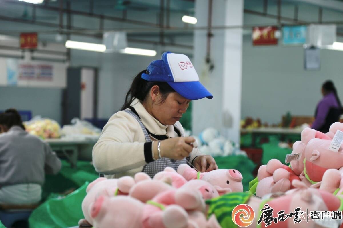 3月9日,在广西乐迪玩具有限公司,一块普通的布料被送入激光裁剪机,3秒钟后,精确的裁片便诞生了。经过工人们熟练的缝合、组装作业,一只只毛绒玩具接连下线,即将从灵山县发往全国各地,并远销欧美、东南亚。