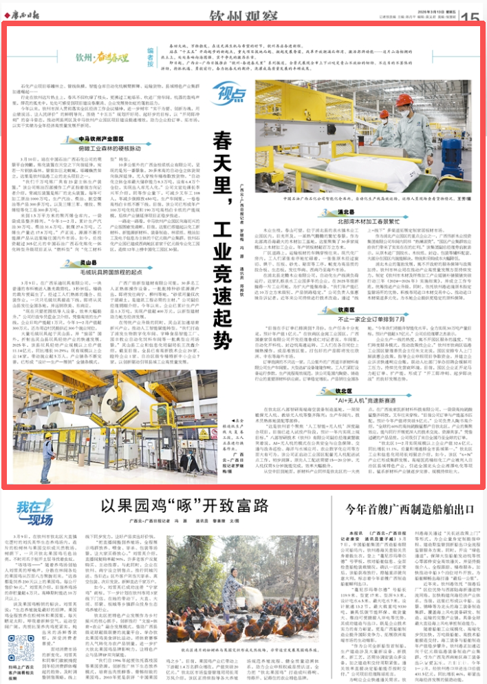 行走在钦州这片热土上,春风不仅吹绿了枝头,更拂过工地塔吊、吹进厂房车间。机器的轰鸣声里,焊花的弧光中,处处可感受到项目建设春潮涌、企业发展势如虹的蓬勃活力。
