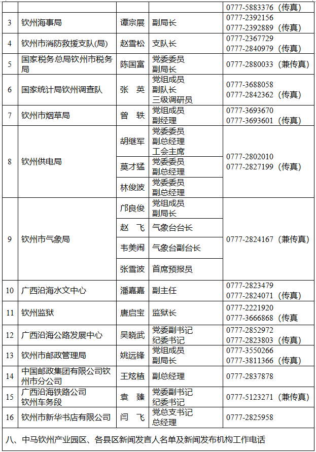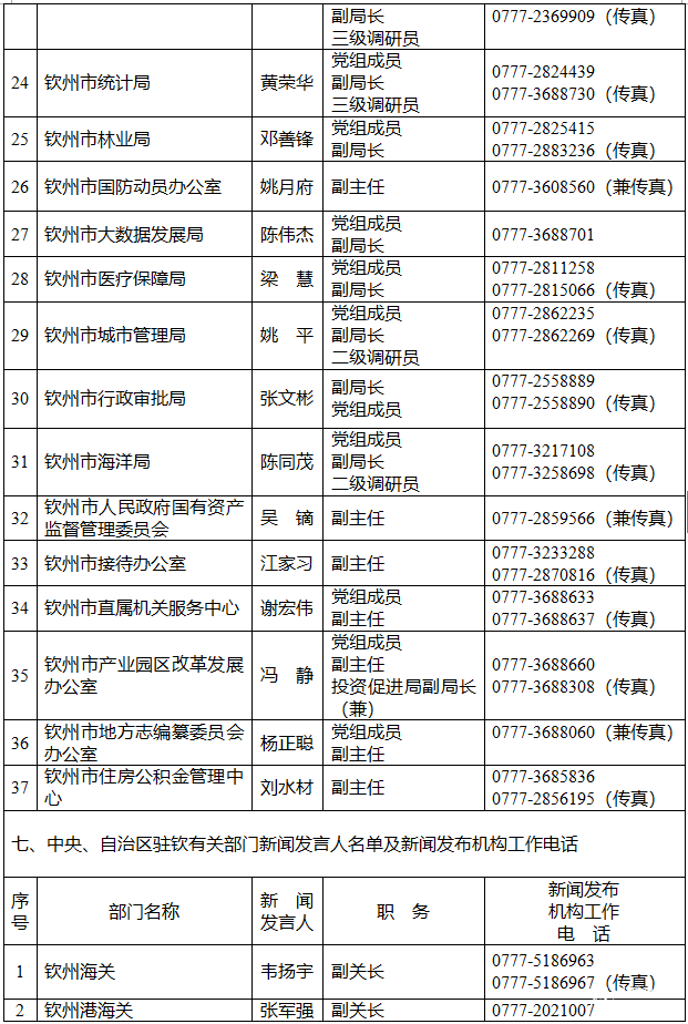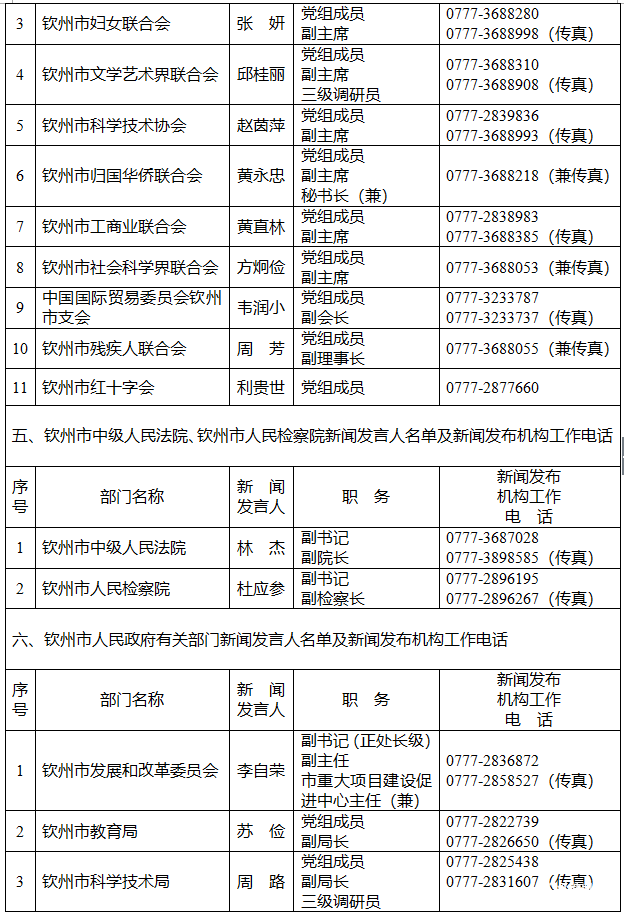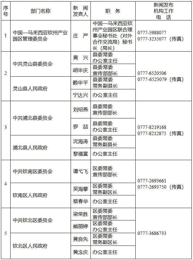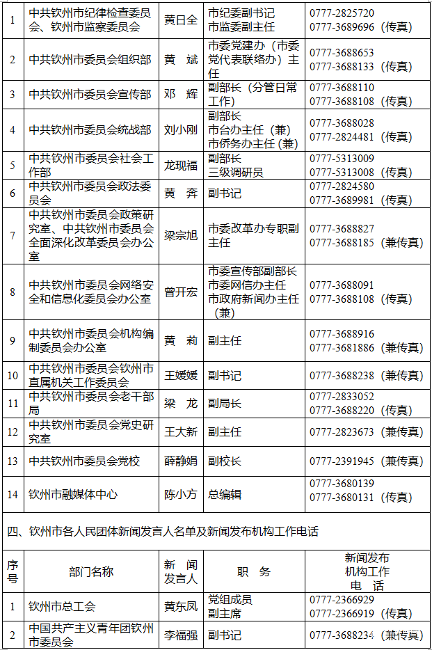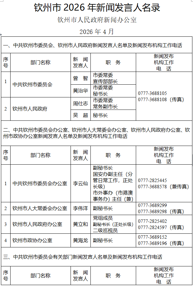 钦州市人民政府新闻办公室公布了钦州市2026年新闻发言人名单及新闻发布工作机构电话。